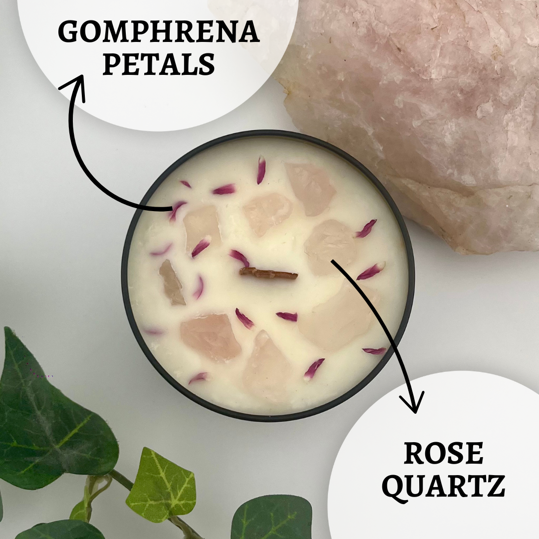 Infused with rose quartz and topped with vibrant gomphrena petals, this candle is crafted to awaken sensuality, and invite emotional healing.